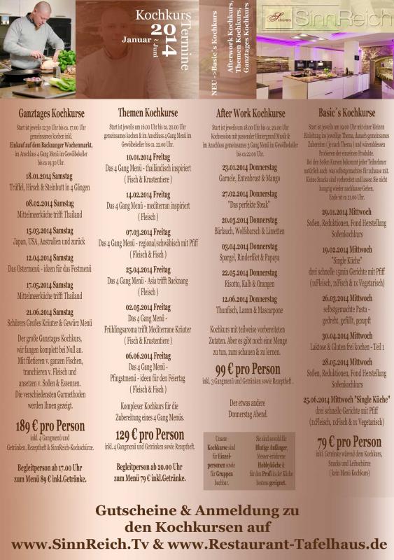 Unsere Events im SinnReich.tv eigenen sich hervorragend für Ihre nächste Firmenfeier, Weihnachtsfeier, Betriebsjubiläum oder als Mitarbeiter-Workshop. ...denn was kann Teamarbeit besser fördern, als ein gemeinsam zubereitetes Menü… Für unsere Manager-Stressless-Seminare bieten wir, zusätzlich in Zusammenarbeit, einen Team-Coach mit an. Unsere Küche ist mit den Modernsten Geräten von Gagenau, Kitchen Aid, etc. ausgestattet.   Alles ist möglich im SinnReich...