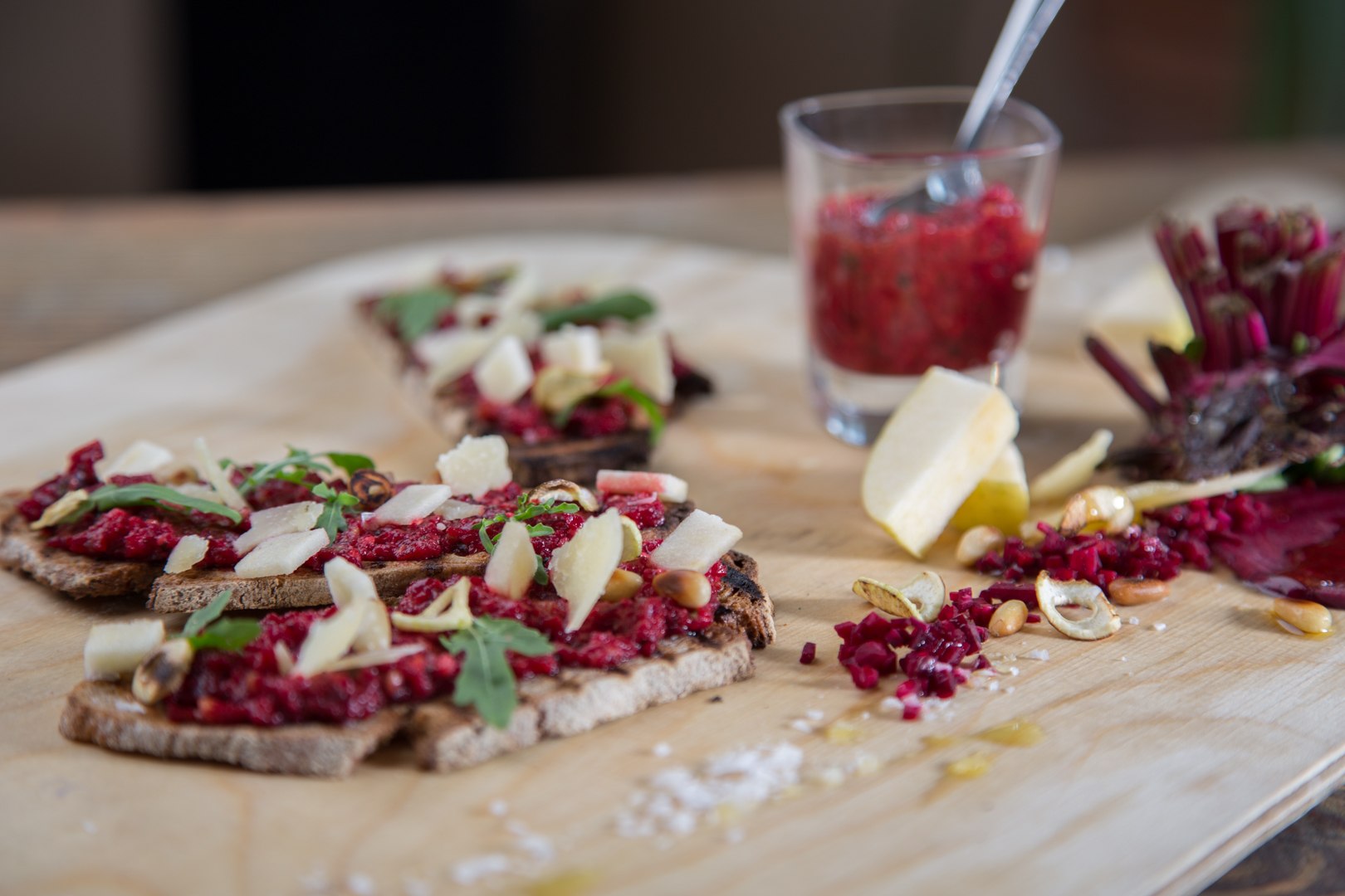 Bauernbrot-Scheiben jeweils dünn mit Olivenöl dünn bestreichen und in einer heißen Pfanne rösten. Die Crostinis großzügig mit Rote-Bete-Pesto bestreichen. Zur Geschmacksintensivierung halbierte Knoblauchzehen in einer Pfanne kurz rösten. Auf den Scheiben verteilen. Apfel in kleine Würfel schneiden. Brotscheiben mit Apfelwürfeln, Parmesan, Pinienkernen und Rucola dekorieren.